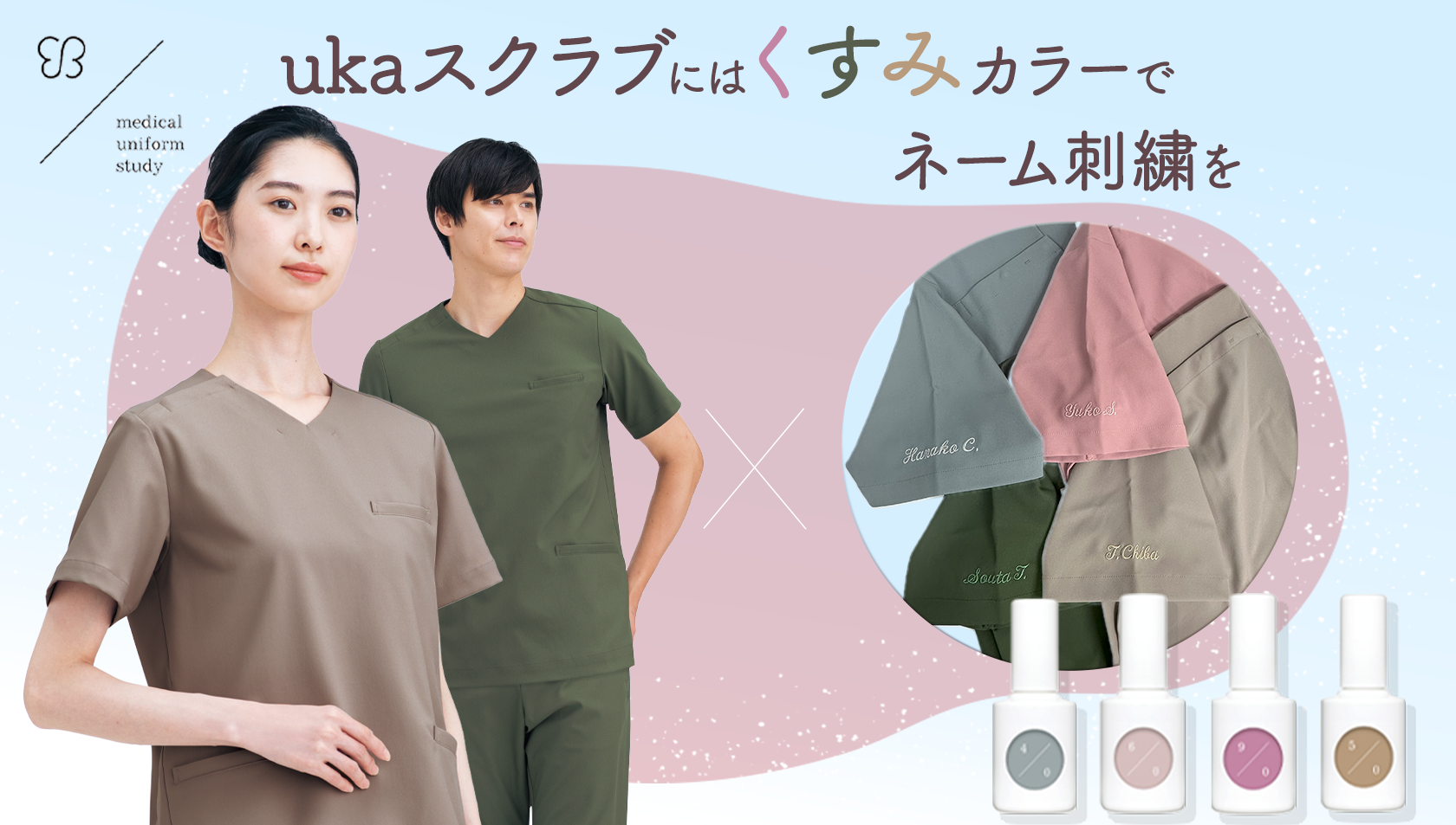 この特集では、人気ブランド“uka”のスクラブを、くすみカラーとネーム刺繍の魅力とともにご紹介します。上品なくすみカラーが院内にやさしい空気を広げ、着る人をより引き立てます。さらに、同系色の刺繍でさりげなく個性を添えれば、毎日の仕事がもっと特別に。"uka"スクラブの魅力気分が上がるユニフォーム、着たことありますか?毎日身につけるユニフォームだからこそ、もっと「うれしくなる」ものを選んでほしい。そんな想いから生まれたukaスクラブは、上品なくすみカラーと洗練されたシルエットにこだわりました。動きやすく美しいシルエットは、一日を快適にサポートします。ukaスクラブは、着るたびに自分を好きになれる...