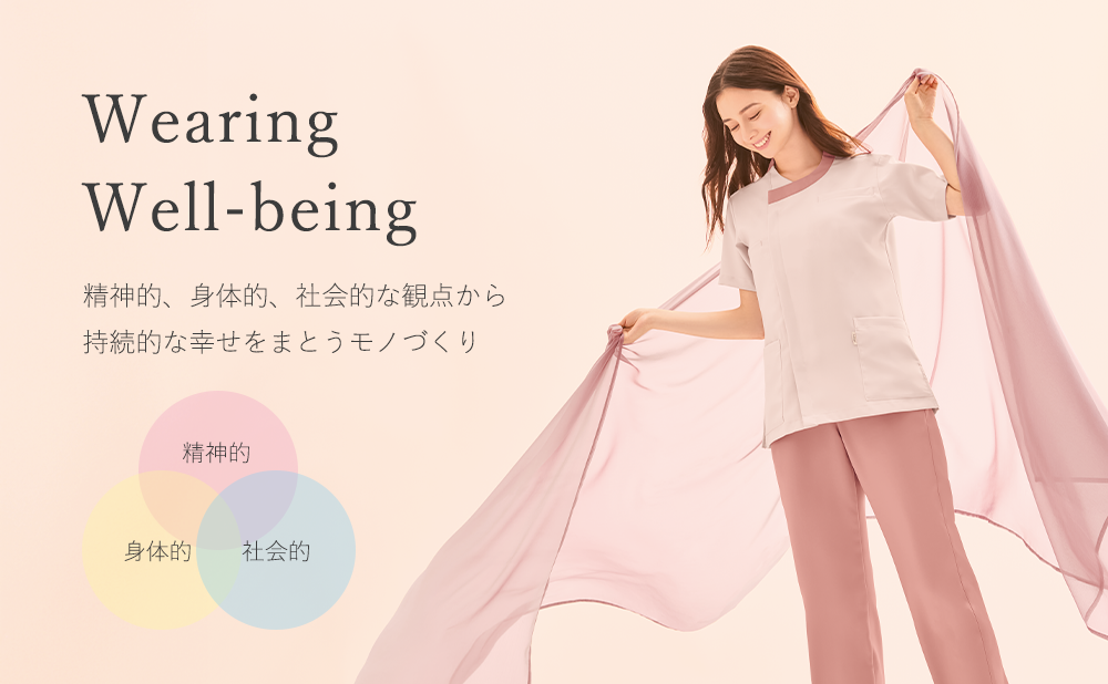 このブランドはユニフォームを通して全ての着用者に明るく幸せな気持ちになっていただきたいという思いから、「Wearing Well-being:持続的な幸せをまとう」という考え方の下で商品を展開しています。