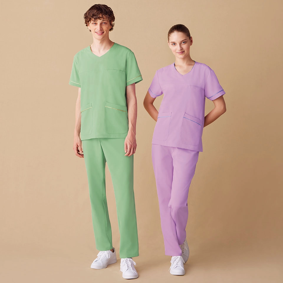 男女兼用モデルでチームの世界観を統一すれば、院内に洗練された清潔感と親しみやすさが生まれます。