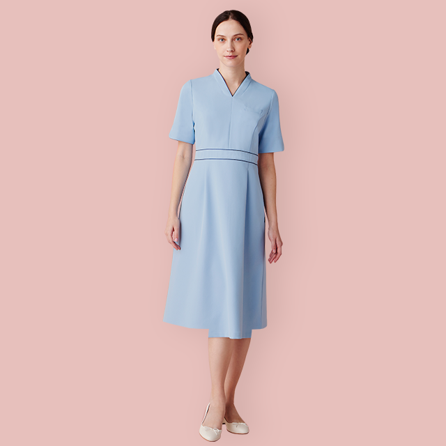 ウエストのパイピングで脚長効果も。長めの着丈と厚手の生地で安心感があるワンピース