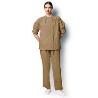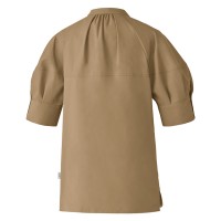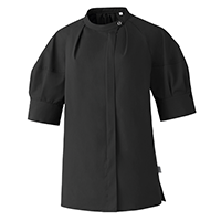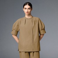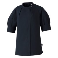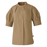 ギャザーデザインのゆったりとしたシャツトップス。広めの袖口とフロントファスナーで容易に着脱ができます。
