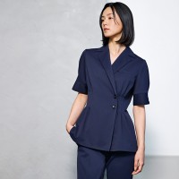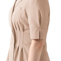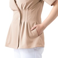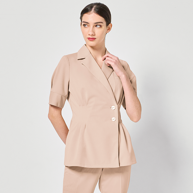 カシュクールデザインにボタン使いがエレガント。シェイプされたウエストでスリムな印象に。美容クリックのウェアにぴったりな上品なデザイン。着心地もよく、シワになりにくく、型くずれしにくい素材でお手入れも簡単です。