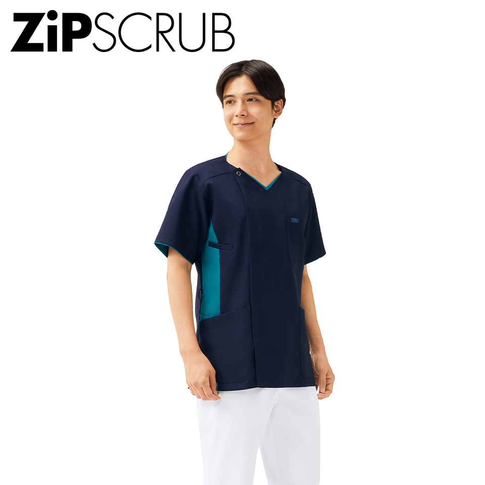 羽織って着るタイプのスクラブ。ジップ部分は男前立(右前)の合わせ。シャツやジャケットと同じ感覚で着られます。