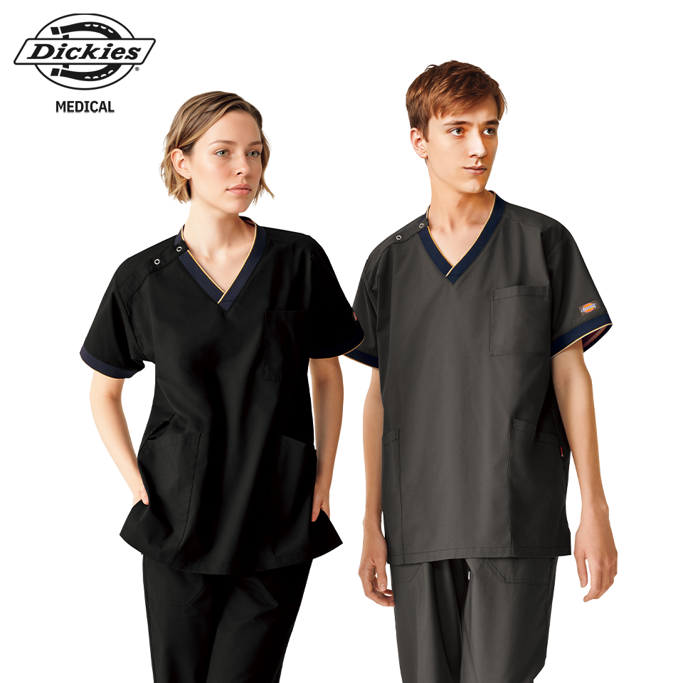 衿元と袖のリブにアクセントカラーをあしらったスポーティーなデザインの男女兼用スクラブ。