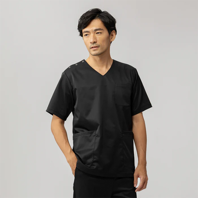 スクラブは主にVネックで頭から被って着用するタイプであり、軽量で腕周りの可動域が広い構造です。