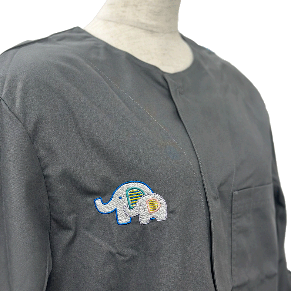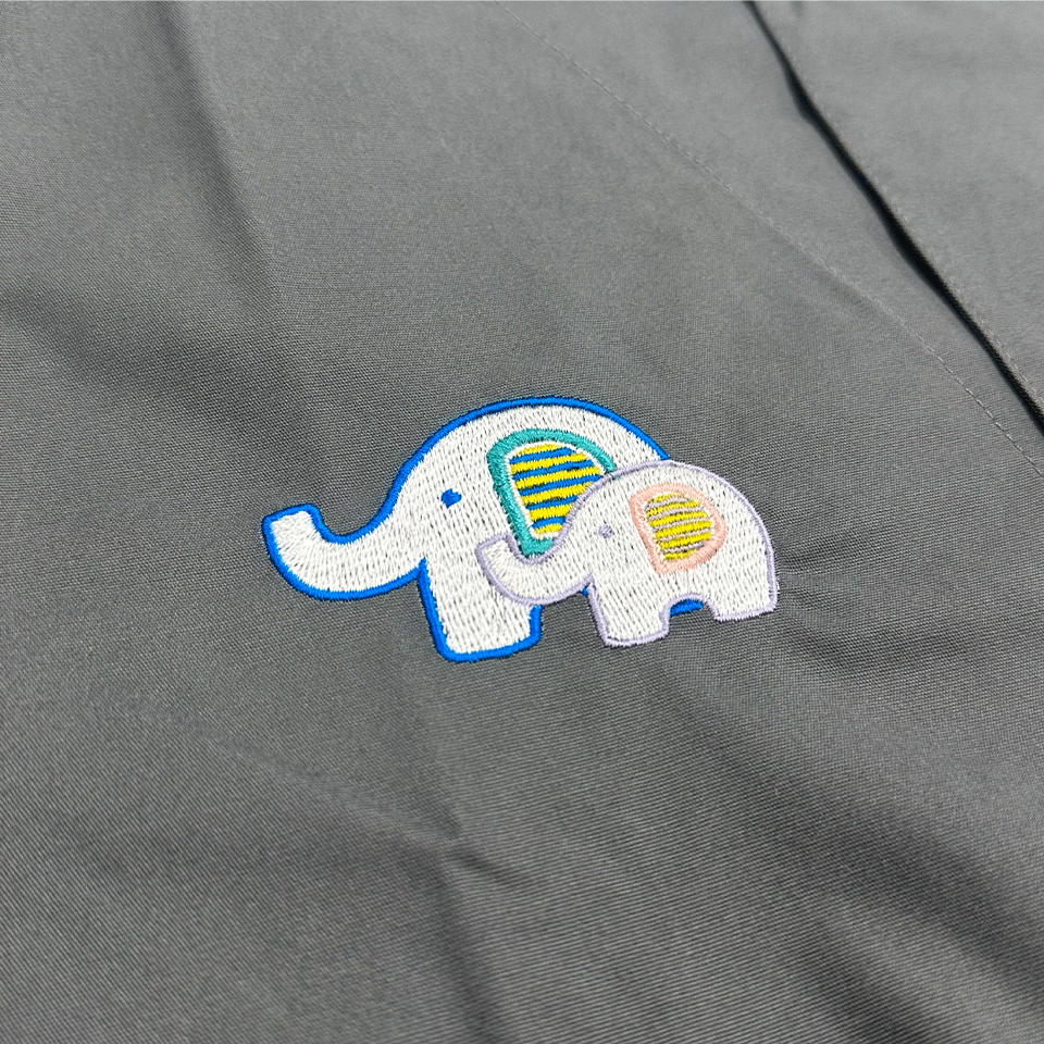 右胸には、カラフルな象の親子が優しく寄り添う、心温まるモチーフを刺繍いたしました。
