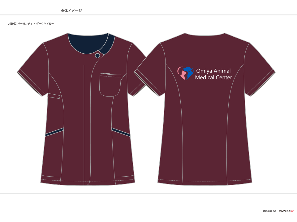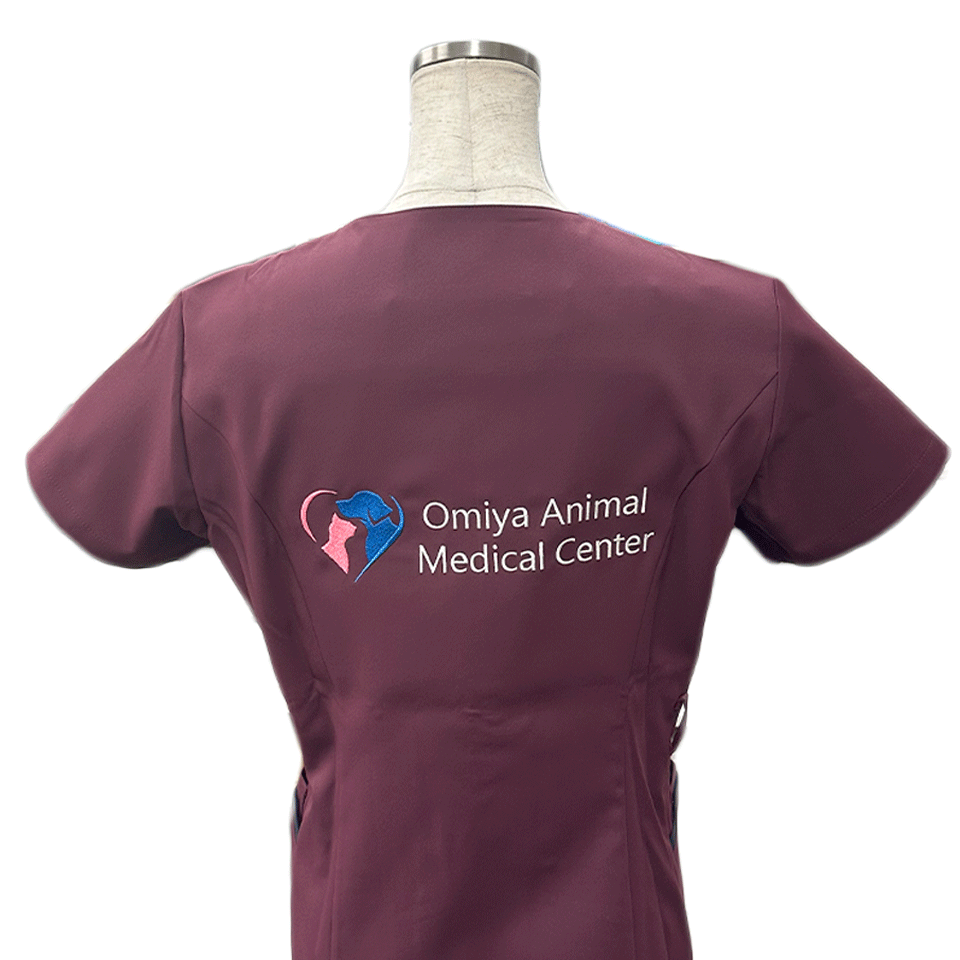 背中に大きく入れた病院ロゴが印象的で、ワイン色のスクラブにとてもよく映えています。