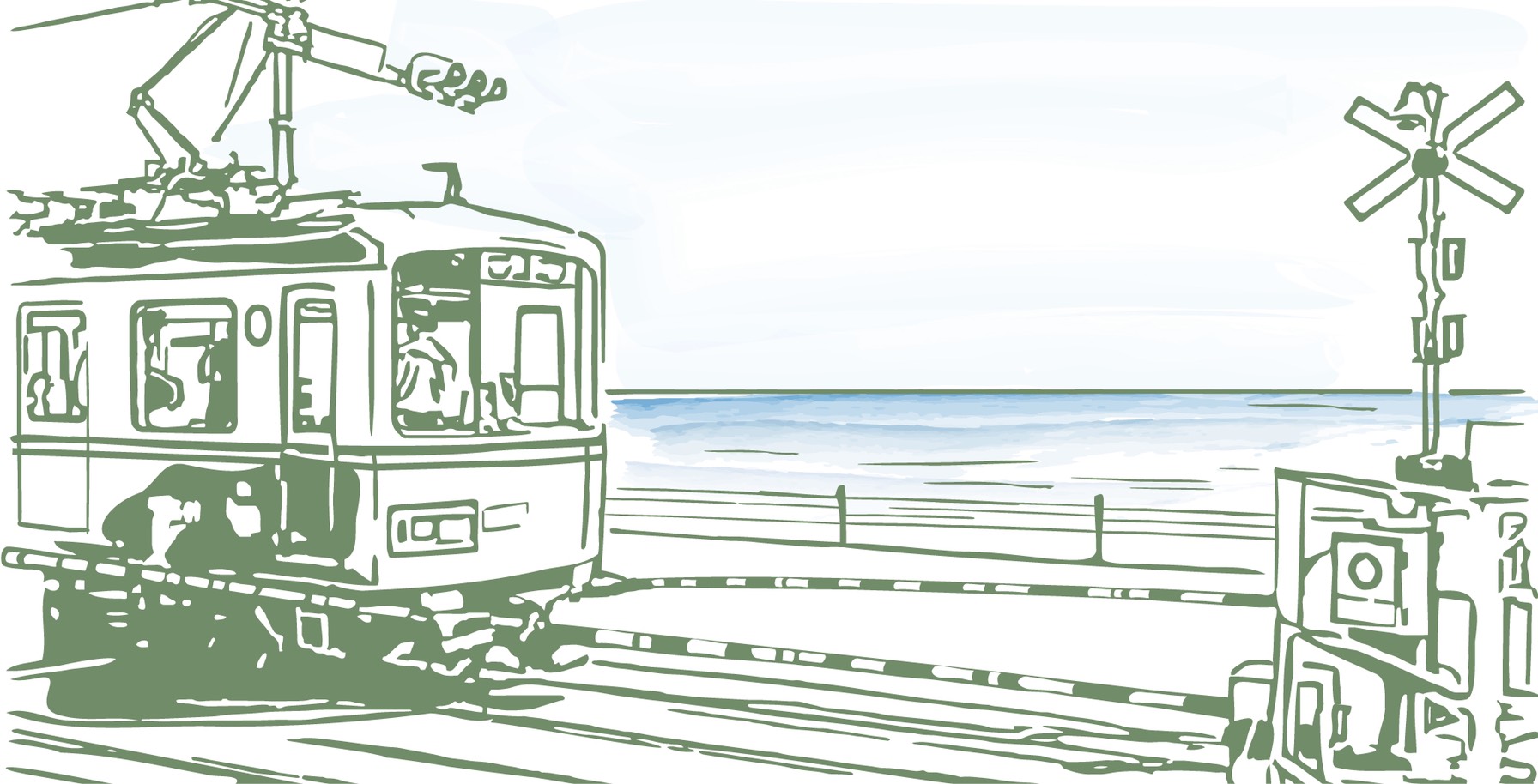 江ノ電の部分は車輪部分の影をうまく残しながら、必要最小限の線で表現しデザインを完成させました。