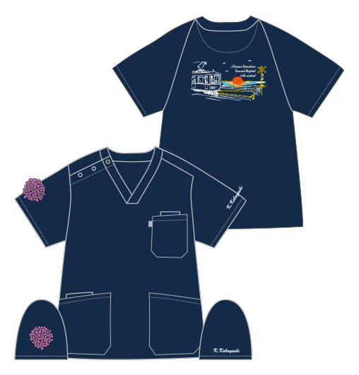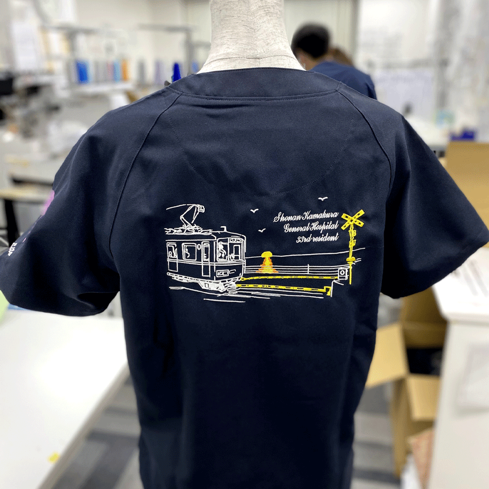 湘南の美しい風景を、スクラブの背中一面に見事な刺繡で描き出しました。
