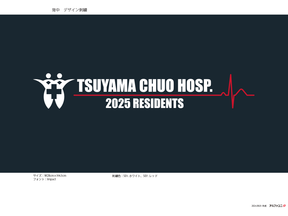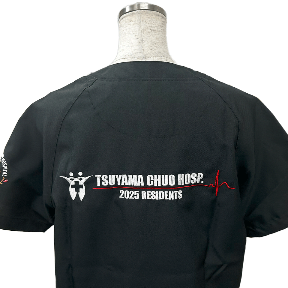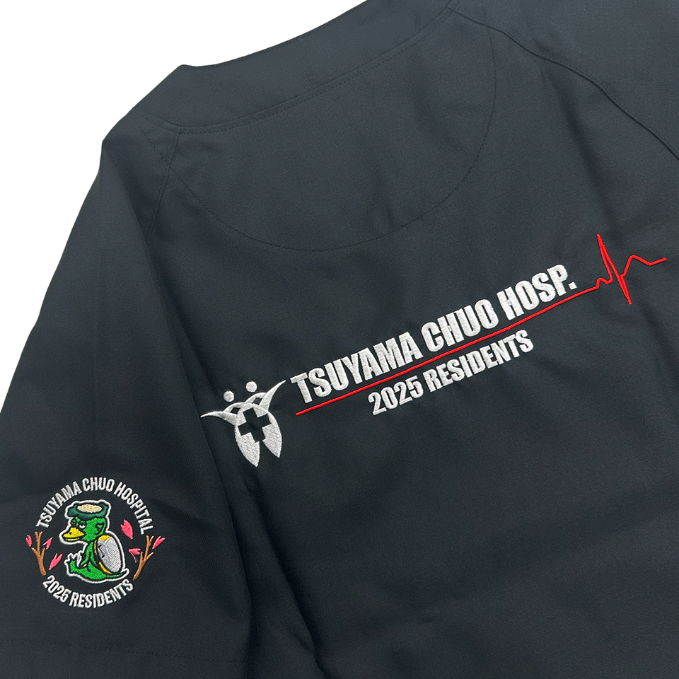 病院ロゴと「TSUYAMA CHUO HOSP. 2025 RESIDENTS」の文字を組み合わせた、非常にシャープでかっこいい仕上がりになりました。