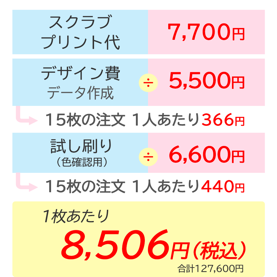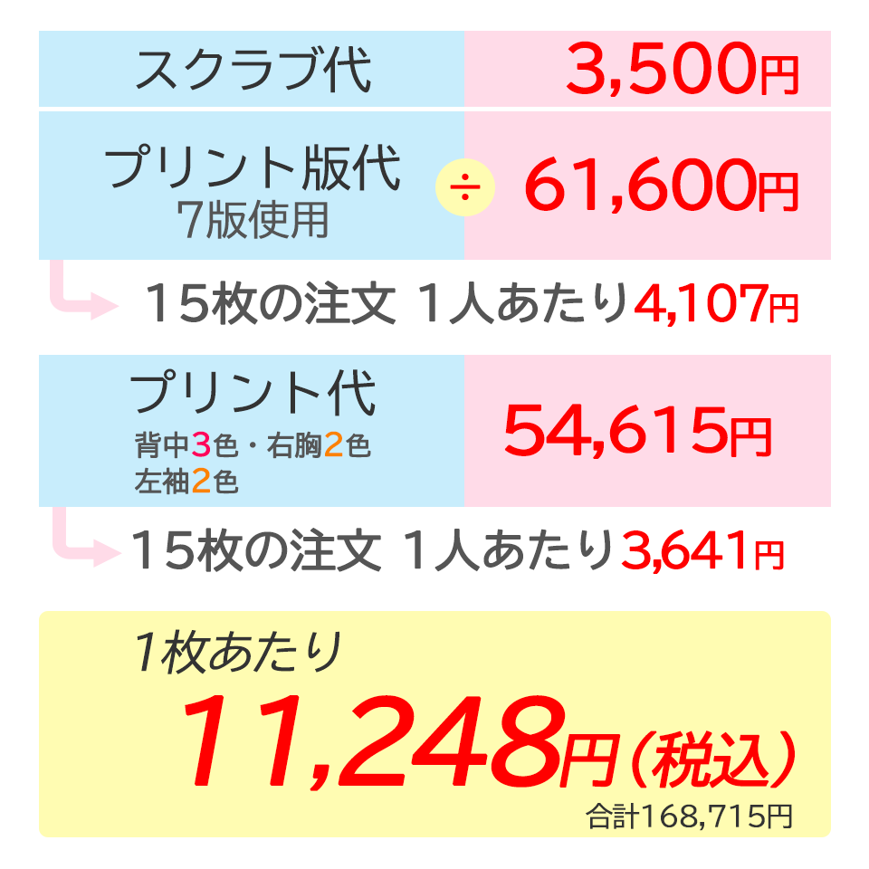 15枚注文 3カ所プリントの場合(デザイン費あり)