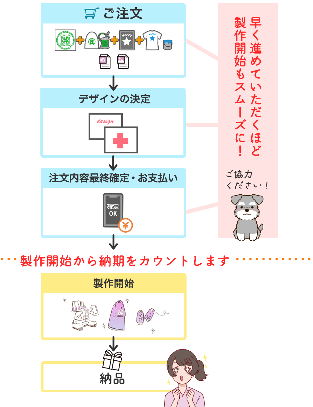 「製作開始」とは、刺繍またはプリントなどの加工作業が実際にスタートする日を指します。