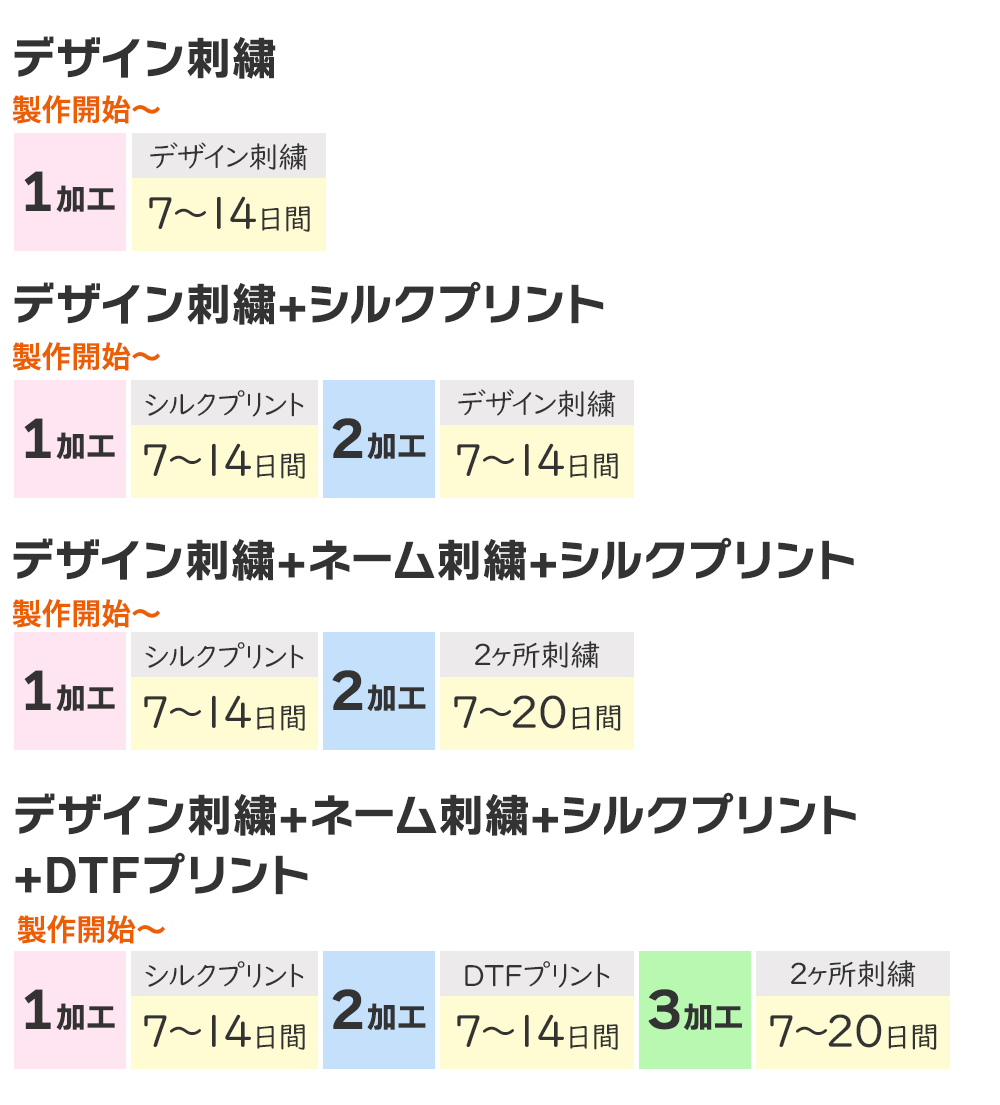 | DTFプリント+えらべるフォント刺繍 | 17~24日間+工場移動日1~2日 |