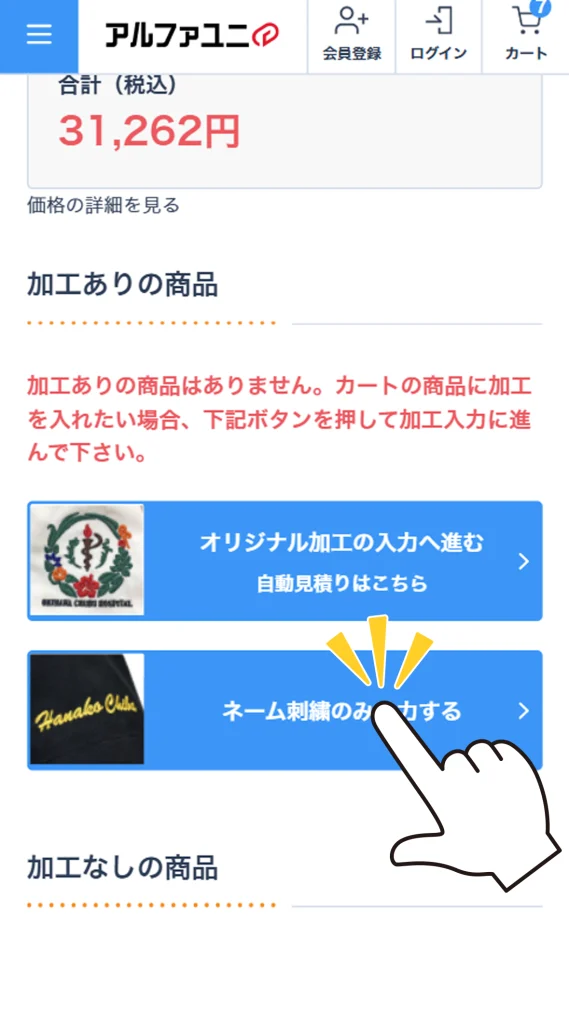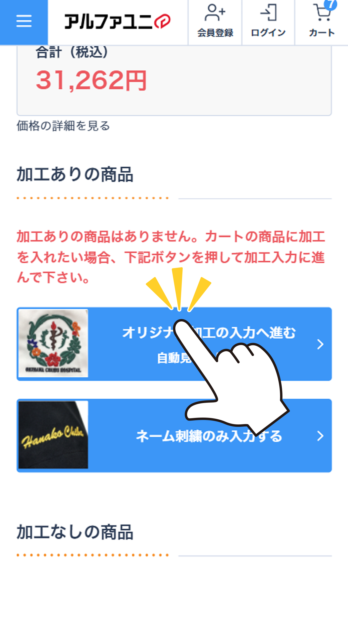 ネーム刺繍のみのご注文の場合は、「オリジナル加工の入力へ進む」は選択しないようお願いします。