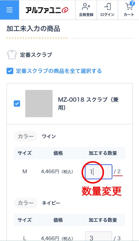 誤って選択された場合でネームを入れない商品があれば【加工未入力の商品】欄で数量変更してください。金額に差異が生じる場合があります。