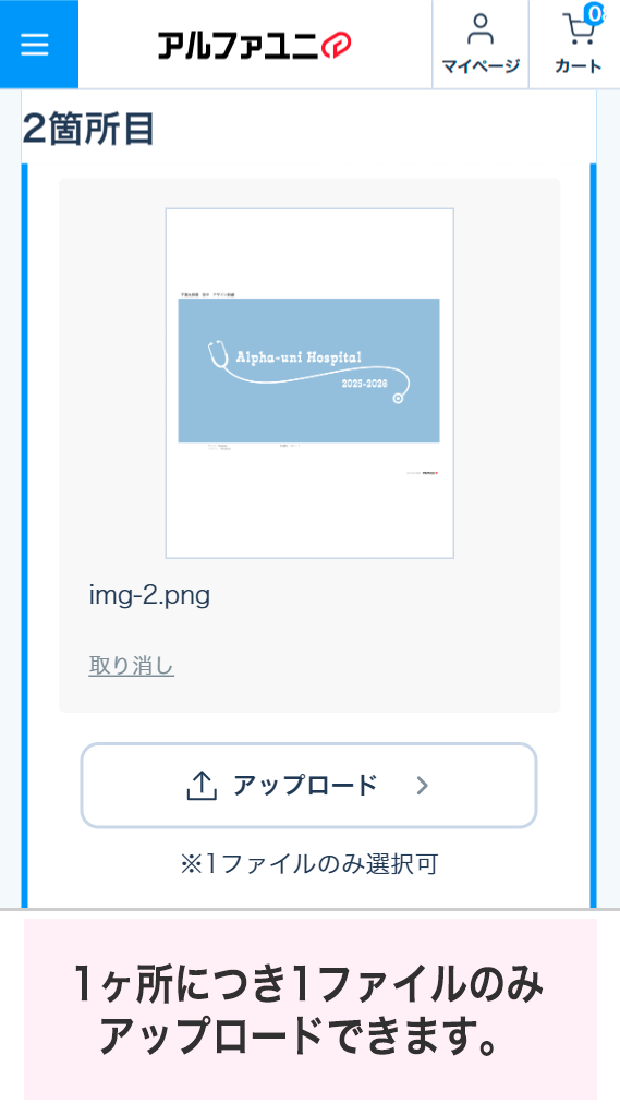 1ヶ所につき1ファイルのみアップロードができます。複数加工がある場合は1ヶ所目アップロード後、「加工を追加する」をお選びいただき加工箇所を追加して画像をアップロードしてください。