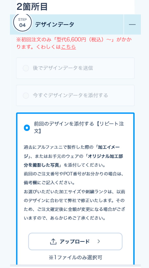 新規注文と同じ手順でお進みいただき、ステップ4(デザインデータのアップロード)の画面にて