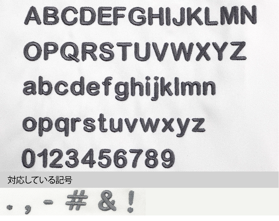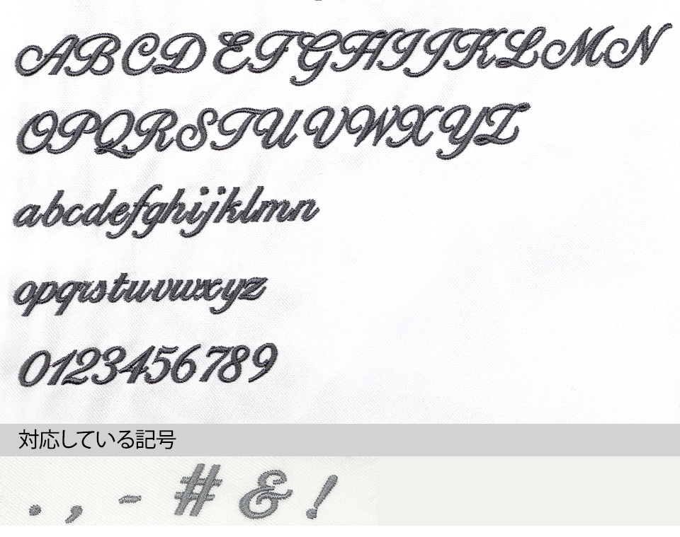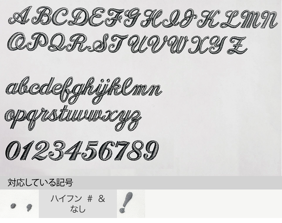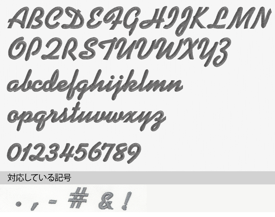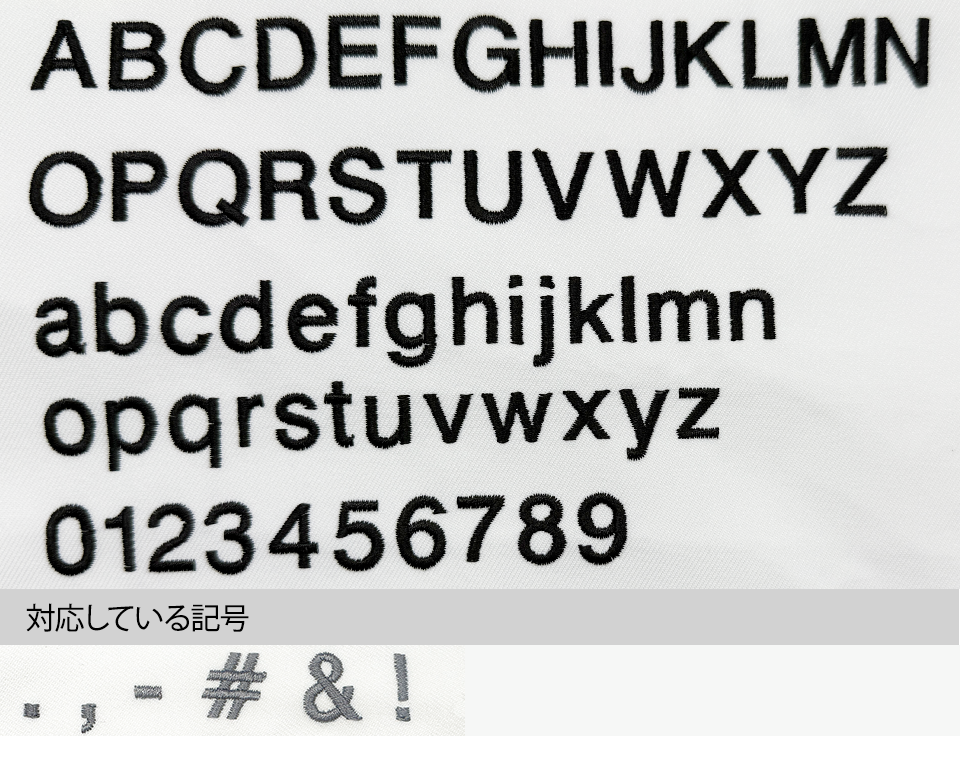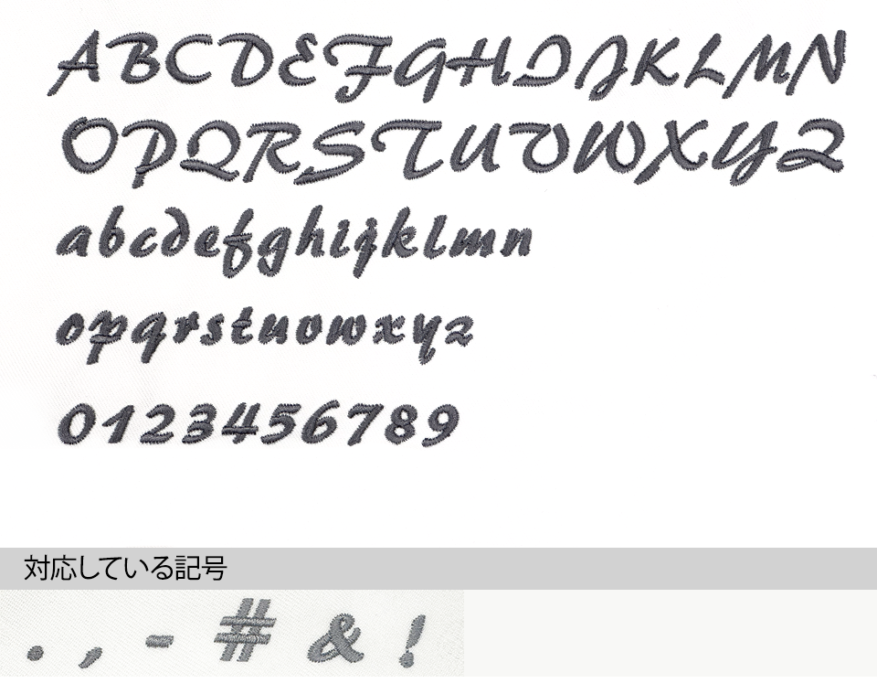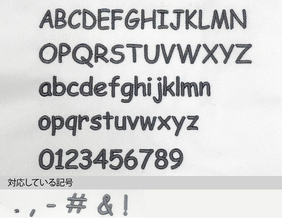 ネーム刺繍は、ミシン内蔵の定型フォントを使用した簡易加工となります。