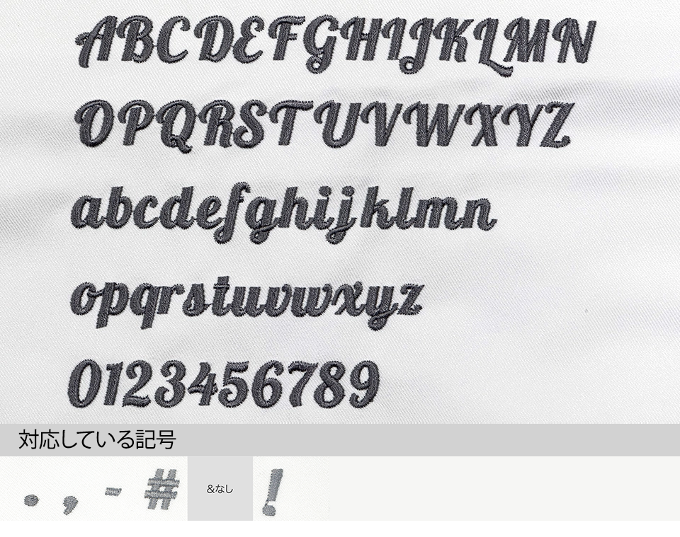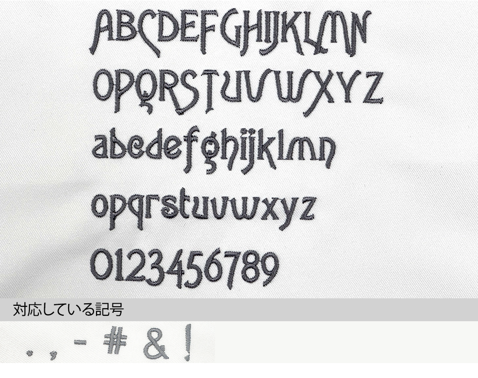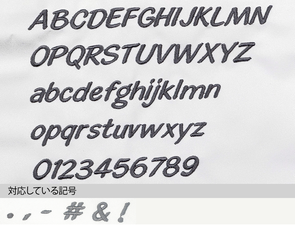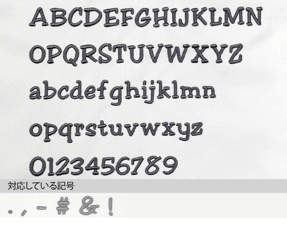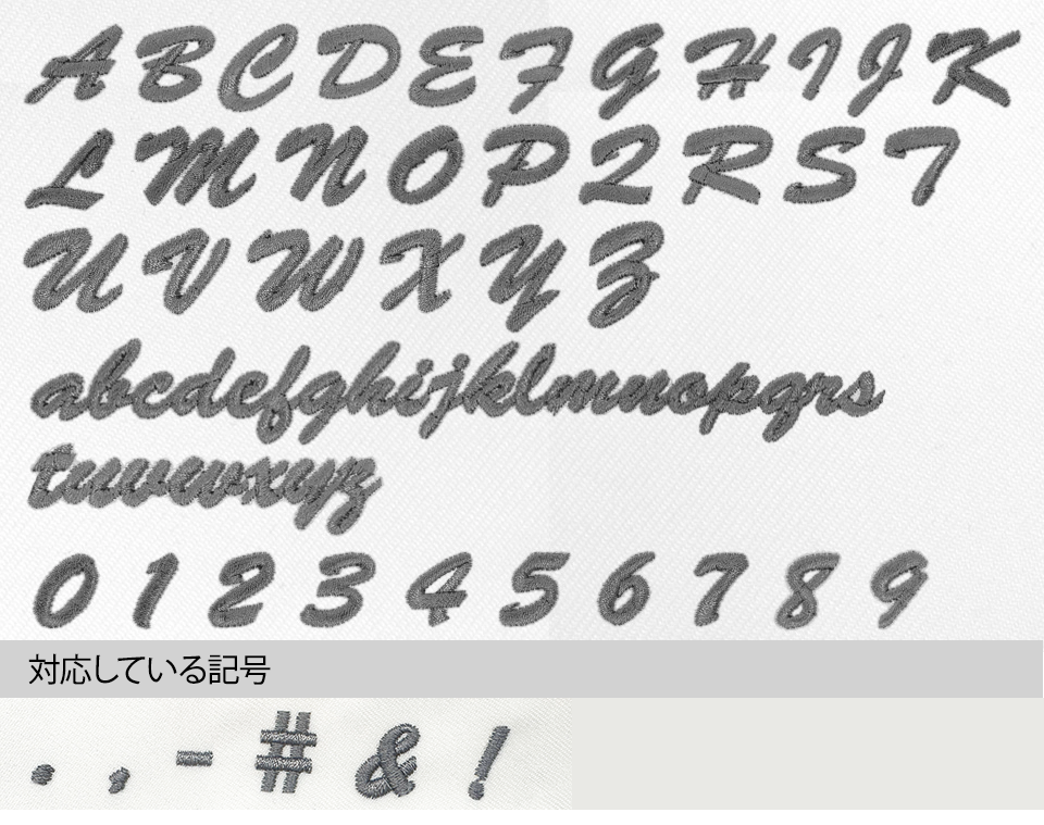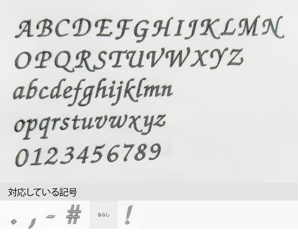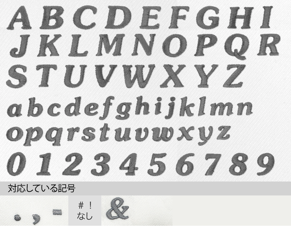 ネーム刺繍は、ミシン内蔵の定型フォントを使用した簡易加工となります。