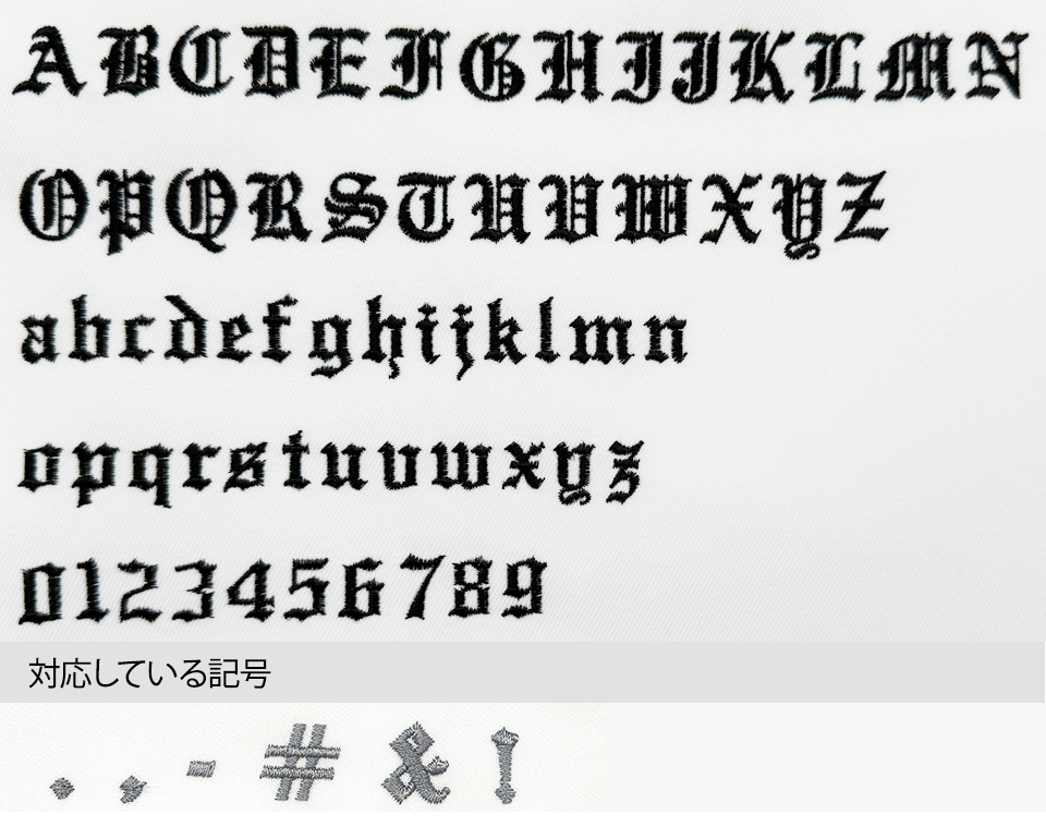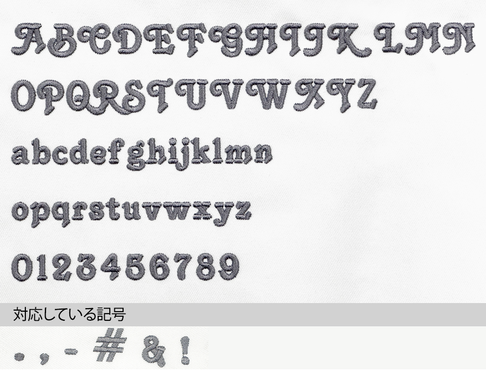 ※コンピューターミシンに搭載されている書体(フォント)を使用するため、告知なく書体が変わる場合がございます。また、前回のご注文と書体が変わる事がございます。